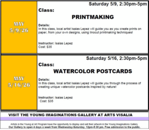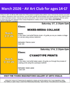 At the AV ART CLUB we offer artists like YOU a place to explore their artistic voice. Choose the classes you want to attend. Whichever class you choose, you will learn specific art techniques and create artwork from start to finish in each individual session. Classes are led by local artists. You’ll receive the full artist experience with the option to show and sell your artwork in the Young Imaginations Gallery at Arts Visalia. FULL and PARTIAL SCHOLARSHIPS available!