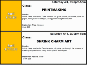 We offer art classes in the Spring (March, April, May) in the Summer (June, July), and in the Fall (Oct, Nov, Dec). The Adult Workshops for ages 16 and up will be scheduled throughout the year.