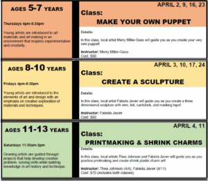 We offer art classes in the Spring (March, April, May) in the Summer (June, July), and in the Fall (Oct, Nov, Dec). We also schedule Family Art Days a few times a year to promote the upcoming schedule, check our google calendar or Facebook events to see what we have scheduled.