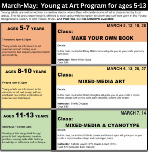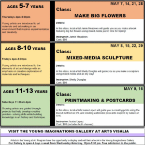 At the Young at Art Program young artists are welcomed into a creative studio, where they will create works of art in classes led by local artists. The full artist experience is offered to each artist with the option to show and sell their work in the Young Imaginations Gallery at Arts Visalia. FULL and PARTIAL SCHOLARSHIPS available!