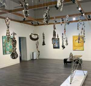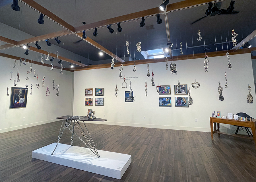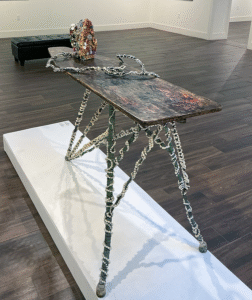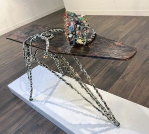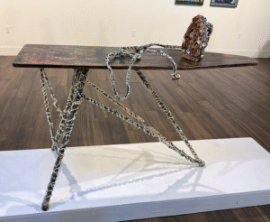 “The work in this exhibit is made from well-used kitchen utensils, a Sunbeam steam iron and my late mother-in-law’s ironing board that she bought from a door-to-door salesman in the 1940s. I used hundreds of vintage pearl necklaces; it is important to note that they once were worn by women who cherished them. It is my desire to suggest the many layered, often beautiful and sometimes tragic nature of our existence.” – Nancy Youdelman