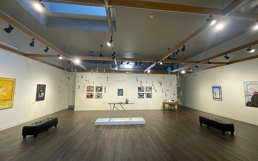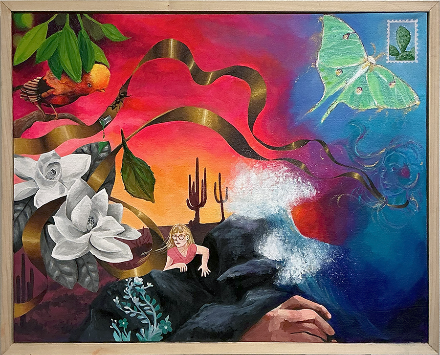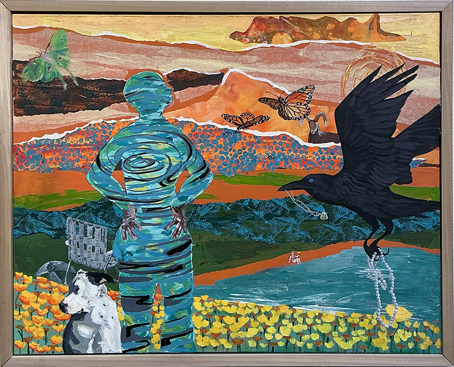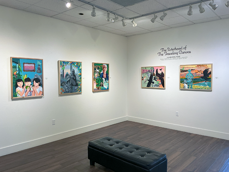 Founded in 2024, the Fresno-based Abnormal Coven exists to uplift and encourage female/femme artists in their artistic work and liberation from patriarchal and capitalist norms. The Sisterhood of the Traveling Canvas project began with building the canvases together, then each canvas was passed from artist to artist for each to respond to each other’s work. The resulting twelve canvases represent the multifaceted reality of each artist as they show up in the world.