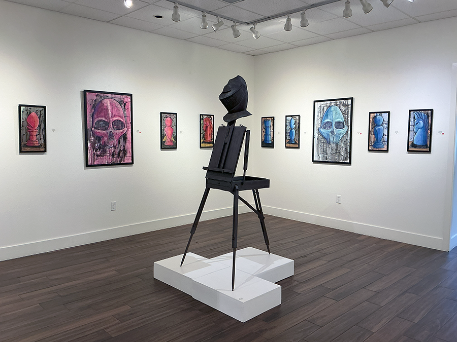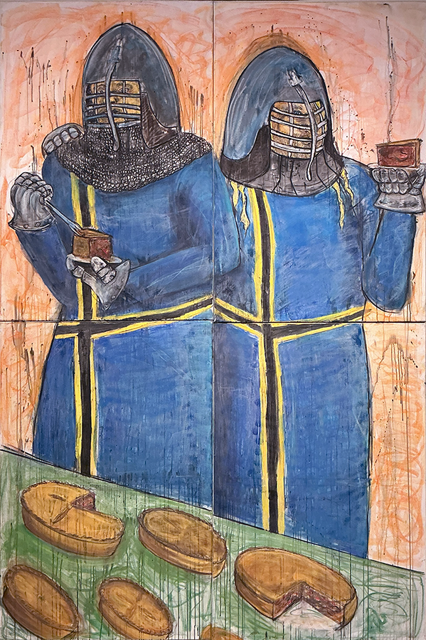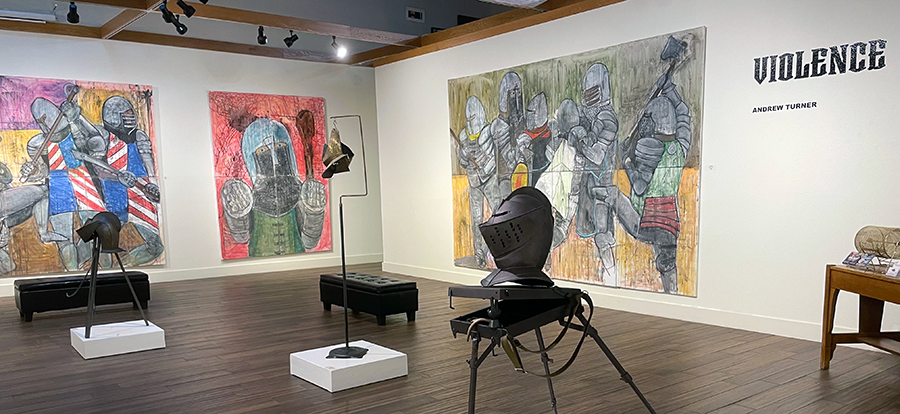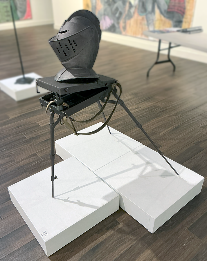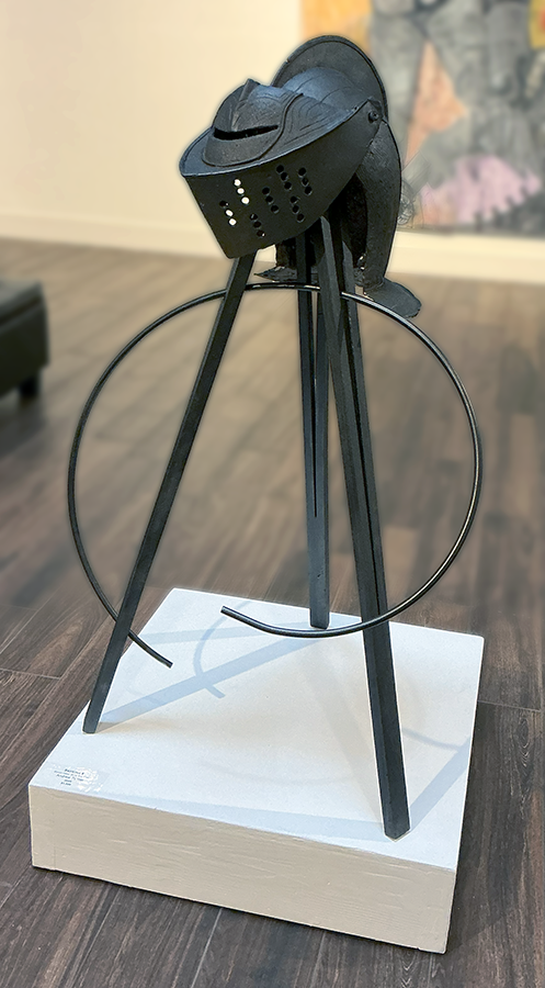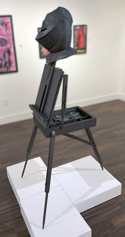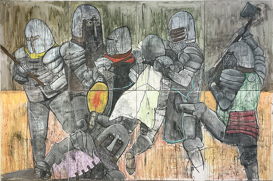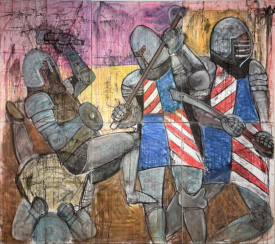 envelop the viewer. The aesthetic subject matter on the surface appears inspired by armored warfare of the Middle Ages yet is symbolically intended to represent the human crisis of violence and its psychological effects. Some details are carefully rendered while others are not meant to aid the sense of movement and guide the viewer through the chaos while in the midst of battle.