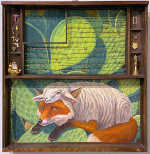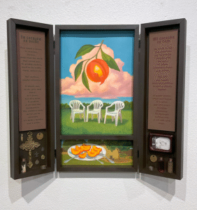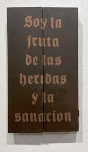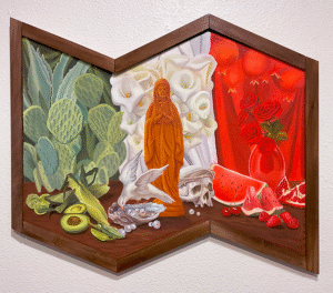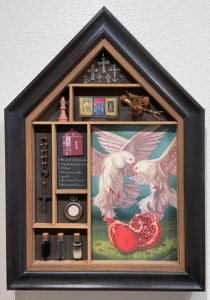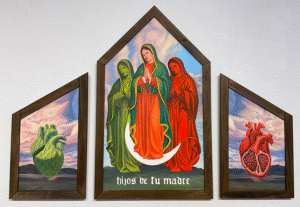 - Soy la fruta de las heridas y la sanación Oil on Canvas, Ink on Paper, Espinas, Pomegranate Seeds, Found Objects, Constructed Frame Triptych 2025 $2,000