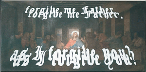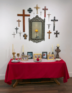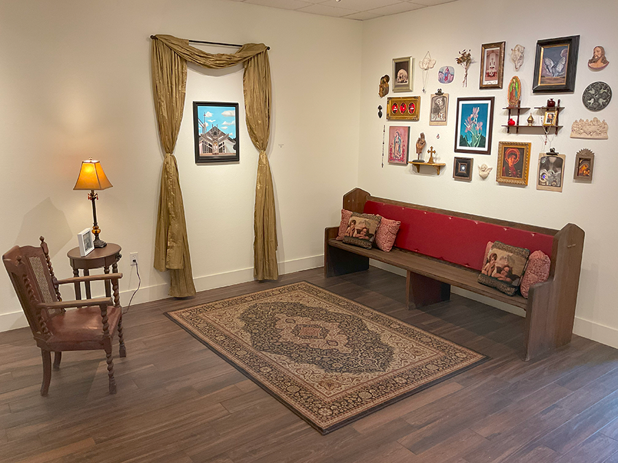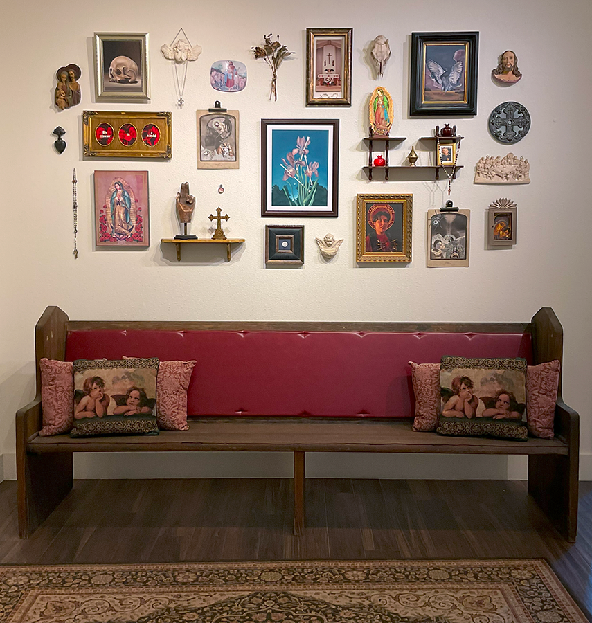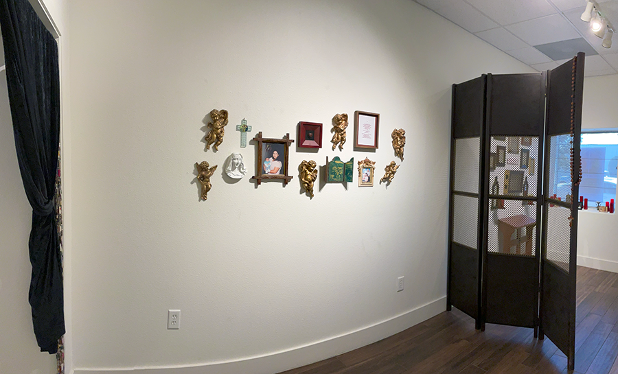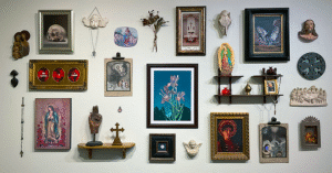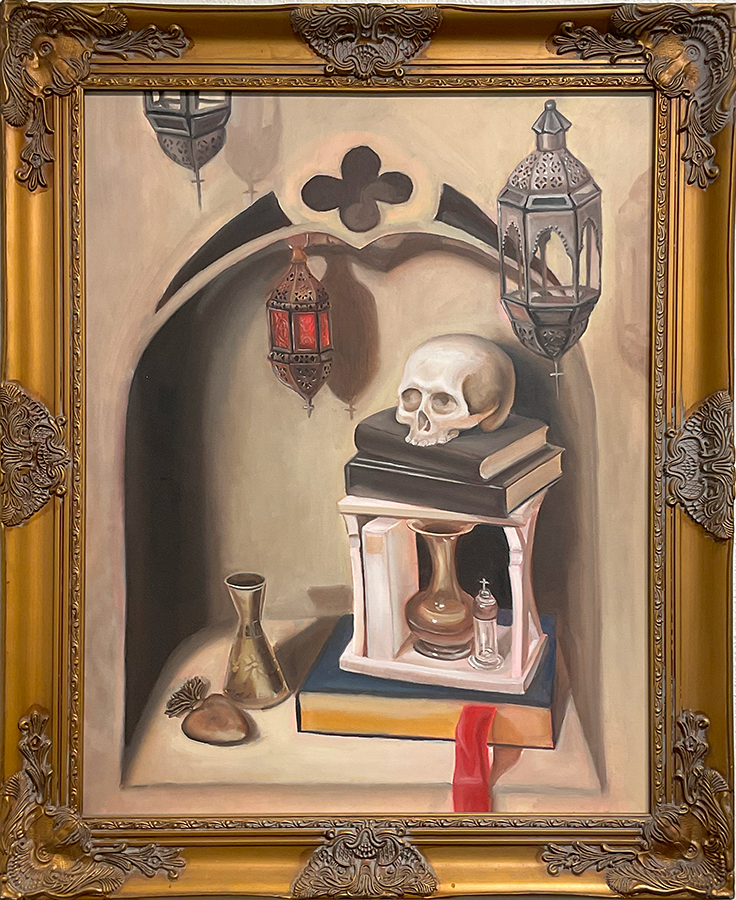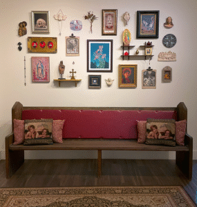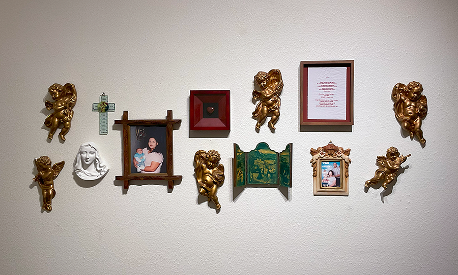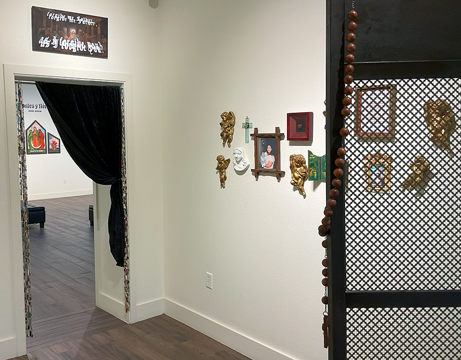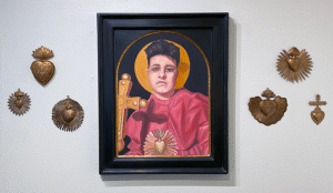 - I commune with my heart in the night Oil on Canvas, Blood, Ash, Confessional Water, Rosary, Dried Flowers, Communion Wafer, Crosses, Constructed Frame 2024 $2,000